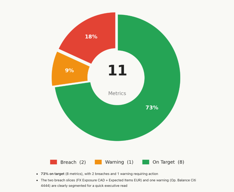 Instead of cycling through ten bank portals each morning, you get a single, real-time view that shows exactly which metrics are on target and which need your attention.