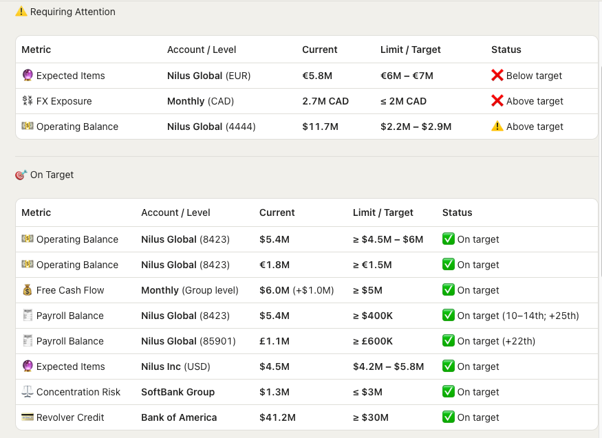 The Nilus Liquidity Agent monitors any metric you define: global and entity-level balance thresholds (fixed, percentage, or factor-based), FX exposure limits by currency, counterparty concentration risk, payroll readiness levels, and cash runway scenarios. Thresholds are fully configurable within the Nilus interface and can be updated conversationally - no configuration tool or IT involvement required.