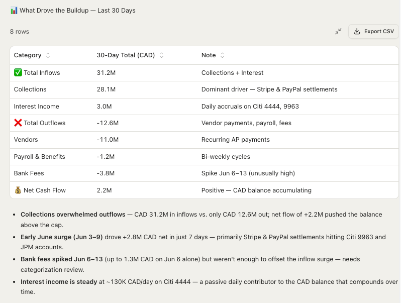 The agent consolidates your total cash position by subsidiary, bank, and currency - giving you a single source of truth across your entire banking stack.